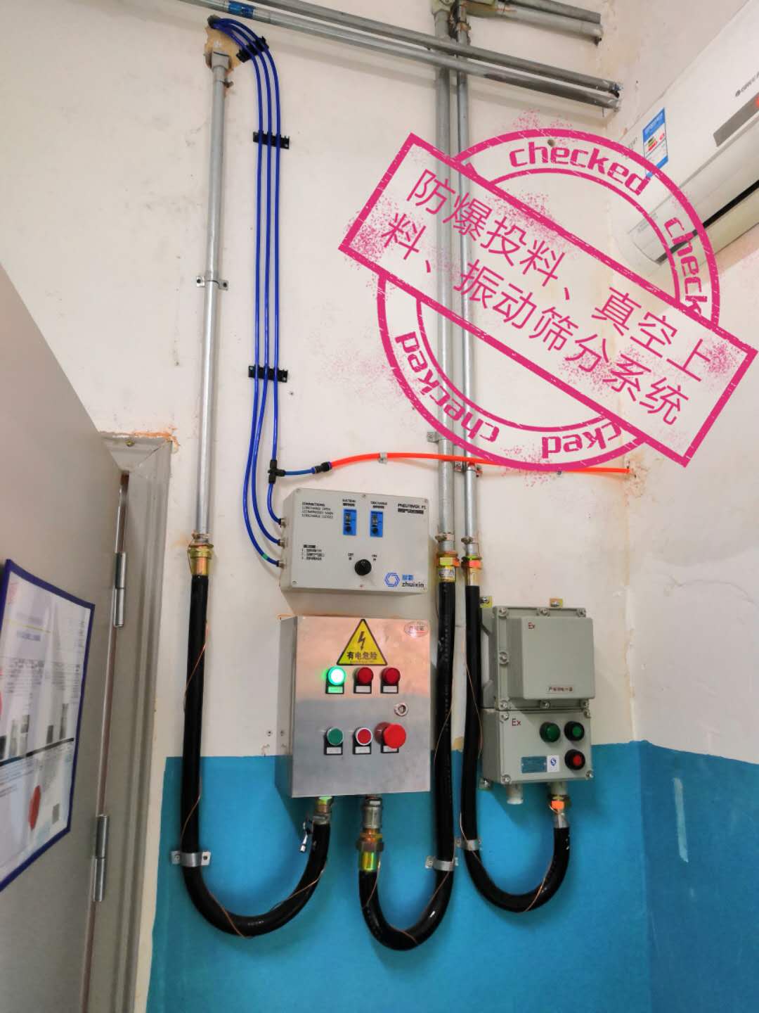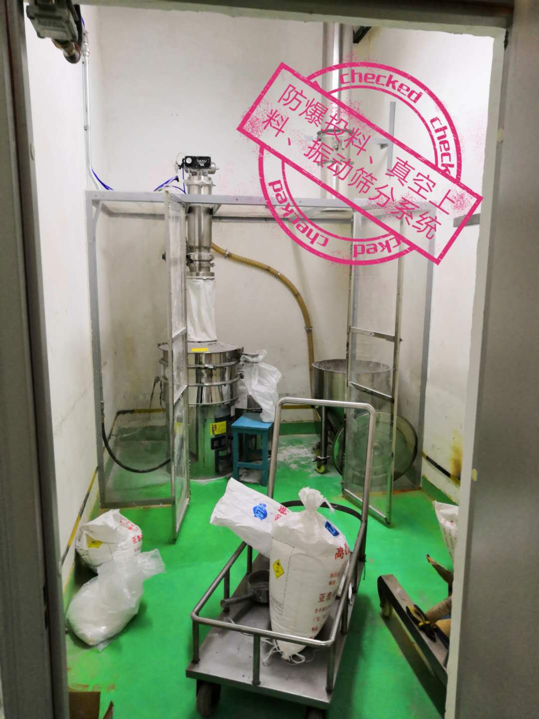 下圖是我司給西安某汽車安全氣囊引爆裝置生產(chǎn)線提供的上料機設(shè)備,此設(shè)備是用來給篩分機上料的,物料為高氯酸鉀,為易爆品,需要符合防爆要求,我司的真空上料機采用全氣動系統(tǒng),動力及控制全部是氣動實現(xiàn),從根源上就符合了防爆要求,而且性能穩(wěn)定,安全可靠。